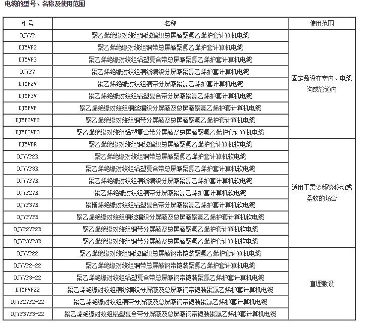 屏蔽材料有圓銅線、銅帶、鋁箔/塑料復(fù)合帶三種。屏蔽對與屏蔽對具有較好的絕緣性能,電纜在使用中若屏蔽對與屏蔽對之間出現(xiàn)電位差時,不會影響信號的傳輸質(zhì)量。 計(jì)算機(jī)電纜的型號、名稱及使用范圍見表。